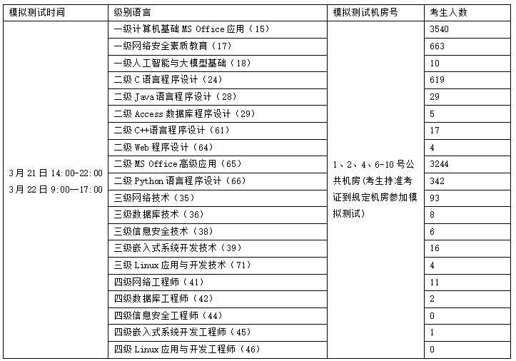 一、模拟上机测试科目及机房对照表