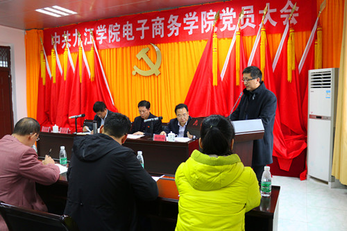 11月16日下午,中共九江学院电子商务学院党员大会在竞秀楼508隆重召开。校党委委员、副校长夏启国同志出席会议并讲话,校党委组织部副部长金葆金同志出席会议,电商学院党全体党员参加了会议。大会由电商学院院长郑祚双同志主持。