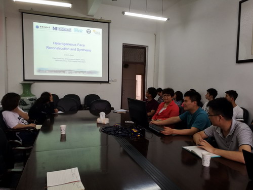 成立仪式结束后,举行了系列报告会。江俊君博士、王正博士、叶茫博士等有国际影响力的特邀青年学者做人工智能系列报告。中国地质大学计算机学院副教授江俊君博士做《Heterogeneous Face Reconstruction and Synthesis》报告,介绍了人脸超分辨率和异质人脸合成领域的前沿成果。日本国立情报学研究所王正博士做《Person Re-identification via Discrepancy Matrix and Matrix Metric》报告,介绍了多媒体检索与分析领域的最新工作。香港浸会大学叶茫博士做《Deep Learning for Cross-Modality Person Re-Identification》报告,介绍了跨模态行人重识别研究的国际前沿。报告会上,人工智能团队的教师们热情参与、积极互动,就深度学习、模态学习等前沿议题提出诸多问题和思考,特邀专家都一一作答。