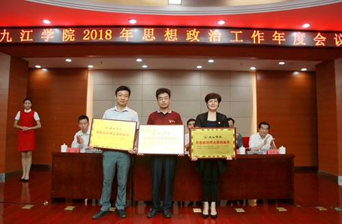 会上,校党委委员、组织人事部部长王殿元同志宣读了《中共九江学院委员会关于表彰2017年度思想政治理论课“创新奖”的通报》。接着,在欢快的乐曲声中,赵伟书记、魏立平副书记、陈春生副校长为获得2017年度思想政治理论课“创新奖”的三位代表颁发了奖牌。