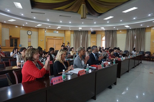 6月5日上午,由美国萨凡纳州立大学副校长兼教务长迈克尔·莱尼担任团长、萨凡纳州立大学孔子学院中方院长罗其娟为领队的萨凡纳市教育工作者文化体验团欢迎仪式在我校行政楼4号会议室隆重举行。校长刘晓东教授、副校长杨耀防教授、国际处副处长王贤淼、文传学院党委书记汤红莲、外国语学院副院长柴克清、国际交流学院副院长何广以及外语学院和文传学院师生代表近50人参加了欢迎仪式。欢迎仪式由王贤淼主持。