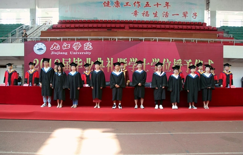 毕业典礼上,九江学院2017年度“大学生年度人物、校十佳大学生、叔子爱莲奖学金获得者电子工程学院A1441班温乔峰同学代表2018届毕业生发言时感恩母校、感谢恩师、感谢父母。他说,九江学院是我成就实现梦想的地方,在这四年里,我们获得了能力的锻炼,明确了未来的目标;树立了正确的世界观、人生观和价值观。我们将始终铭记“竞知向学厚德笃行”的校训,在实践中检验自我,发现真知,衷心祝愿我们的母校明天更加美好!