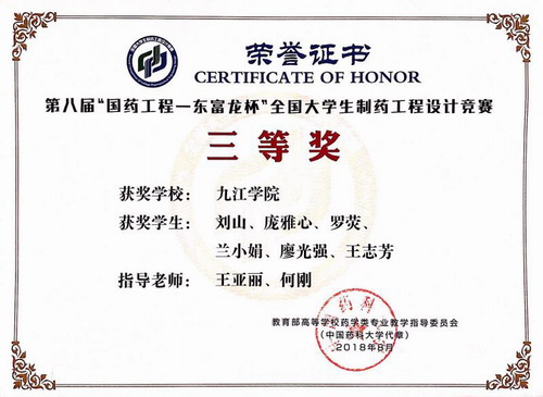 该项竞赛是目前全国制药工程专业影响力最大的设计类竞赛。本届大赛的参赛题目是“口服固体制剂车间设计”,全国共计133所高校279支队伍报名参赛。大赛采取队伍限制原则,每个学校最多提交三份有效作品,并设立了全国一等奖12项、二等奖72项、三等奖84项。我校药生学院连续第二年参赛,并取得佳绩后,获全国二等奖、三等奖各一项。