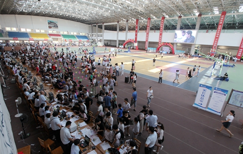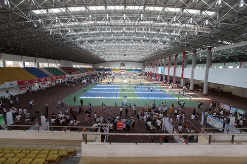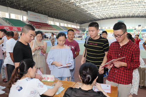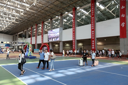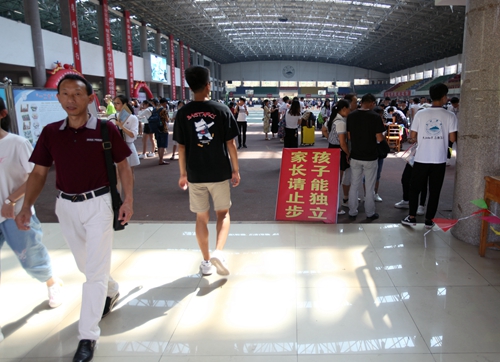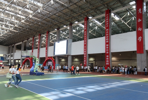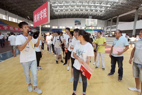 田径馆门外热闹非凡,场馆内更是人声鼎沸。早已做好充分准备的校迎新现场各部门和各二级学院的老师与同学热情地接待了每一位经历了舟车劳顿的新生们。