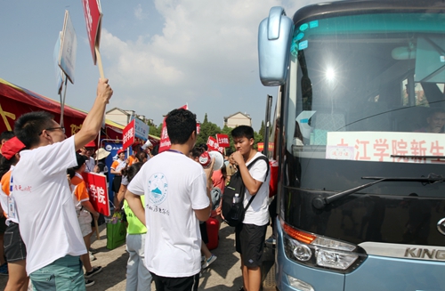 上午7:30开始,接新生的校车一辆接一辆抵达校室内田径馆新生报到处,大约每5分钟就有一班从火车站和汽车站迎新归来的校车。而负责接待的志愿者早已翘首等待在迎新总站的门口,用他们最直接最热情的方式迎接着每一位奔赴九江学院求学的学弟学妹们。总是可以看到每批校车抵达之际,热情的志愿者高举各院标志牌,沿着车窗高呼自己院系的名字,热切接待着来自祖国各地的学弟学妹们。