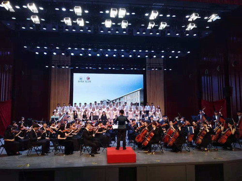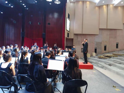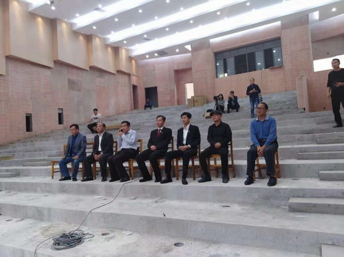 赵书记一行先在正在修建中的音乐厅内观看了九江交响乐团和艺术学院合唱团的排练。得知乐团正在为参加江西省教育厅组织的改革开放40周年合唱比赛努力排练,感到很欣慰。赵书记指出,九江交响乐团是“市长工程”,一定要建设好。他勉励大家要努力排练,确保交响乐团元旦首场音乐会达到预期效果,充分体现九江学院的风采、九江的水平。赵书记还简要介绍了学校的新区建设规划和高层次人才引进等情况。