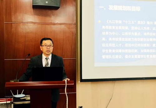 上午,学校在行政楼党委会议室举行了汇报会,汇报会由杨耀防副校长主持。校长刘晓东致欢迎词,他介绍了九江学院的情况,希望专家组为九江学院留学生教育问诊把脉,提升学校的来华留学教育和管理质量。