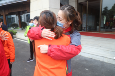 市卫健委党委委员徐端到场为在该处休整的援鄂医疗队护理队队员们举行了简短的欢送仪式,他代表九江市卫健委向全体队员表示了关心和敬意。随后,我们两位队员与在湖北一线共同奋斗几十天的战友一一拥抱道别,跟随医院领导和我院工作人员登车启程返回九江。