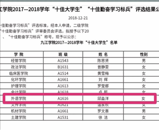 她是班级和专业双第一的学霸,是九江学院国旗班的一员。她在各种比赛上荣获了不少奖项,更在今年的考研中成功“上岸”,被苏州大  学录取。榜样离我们很近,模范在我们身边。快来一起看看,九江学院2019年度“大学生年度人物”邱淼洋有着怎样的故事吧。