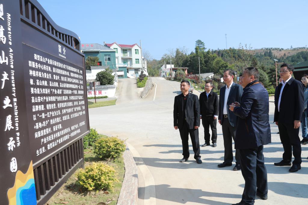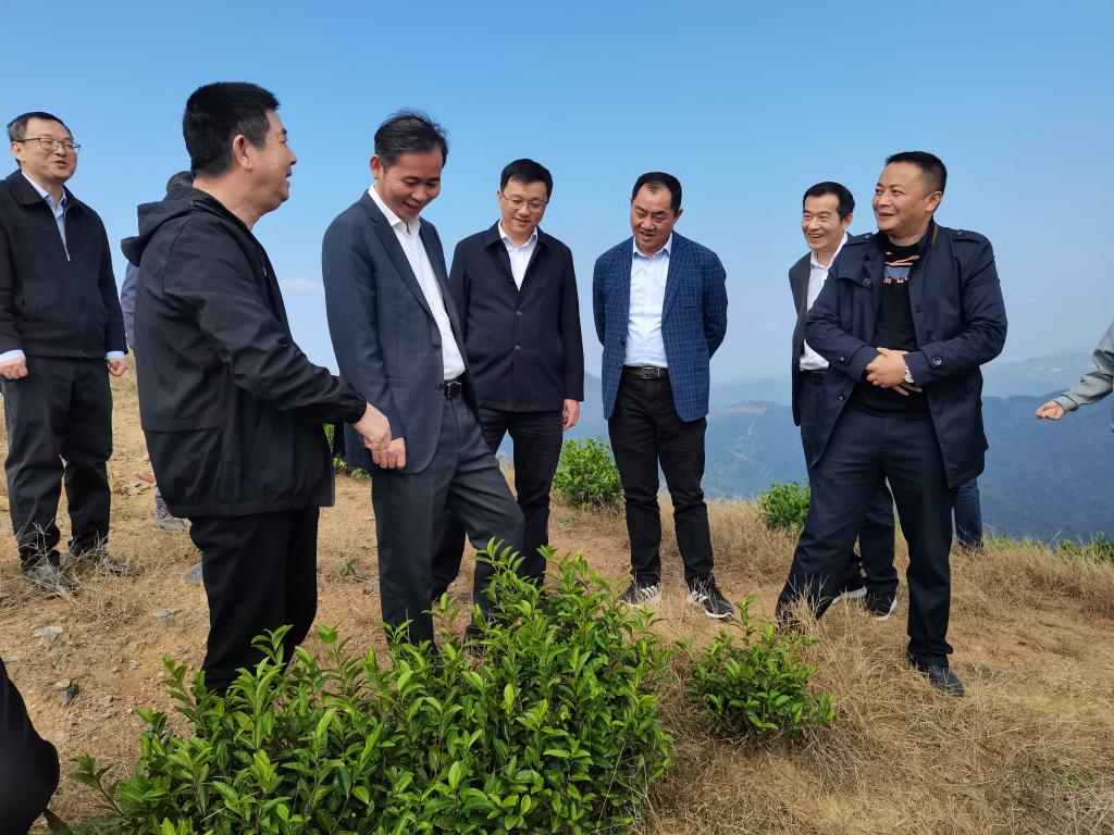 此次调研分为实地调研和座谈会两个部分。在双新村微型高山产业园,赵伟首先了解了双新村产业发展及乡村振兴产品——高山辣椒和黄金茶的种植情况,尤其是大棚种植、林下经济的发展情况。
