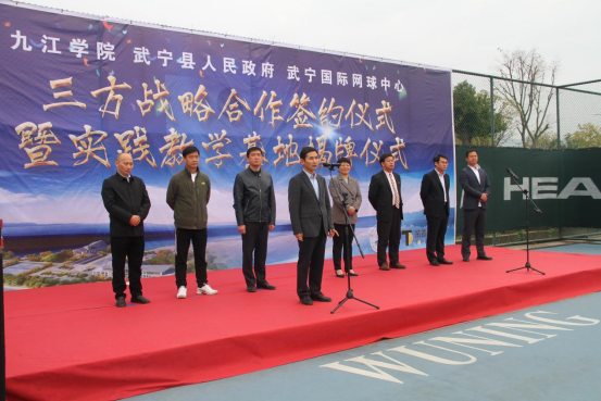 张宇峰代表武宁县致辞,他表示,举行九江学院、武宁县人民政府、武宁国际网球中心三方战略合作签约暨实践教学基地揭牌仪式,既是武宁县加快推进“生态强县作示范、绿色崛起勇争先”总体发展战略的重大举措,也是积极落实习近平总书记加快建设体育强国的具体行动。他表示,凭借武宁优越的生态环境、有力的政策支持,九江学院良好的师资队伍、优质生源以及国际网球中心完善的场地设施、一流教练团队,三驾马车策马扬鞭、齐头并进,为武宁乃至九江旅游产业、体育事业高质量发展提供强大动力。