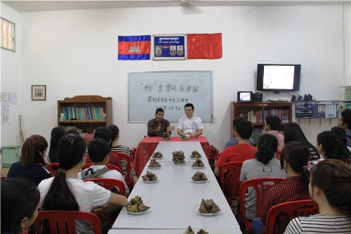 任诺特校长首先向大家问好并讲了他所了解的中国端午节,他告诉在场的柬埔寨学生:“中国的端午节已经有两千多年的历史了,是中国很重要的传统节日,柬埔寨的送水节有一项活动——赛龙舟,和中国端午节的习俗相同,这昭示着中柬一家亲的深厚情谊”。接着,刘振老师代表孔子学院祝福在场的所有人“端午节安康”,刘老师向大家介绍了端午节吃粽子、赛龙舟、采艾草、喝雄黄酒等习俗,并表达了对在座的各位汉语学员的美好期望:希望他们把汉语学好,以后努力做中柬两国经济文化教育等各方面交流的使者和桥梁,促进中柬两国兄弟般的情谊更上一层楼。