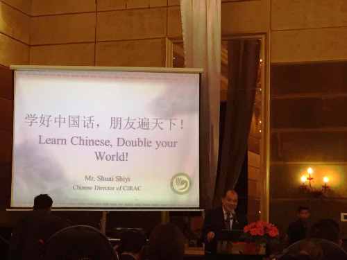柬埔寨王家研究院孔子学院中方院长帅式毅应柬旅游部邀请参会并做演讲。帅院长上、下午分别做了“学好中国话,朋友遍天下”、“针对中国游客的酒店及旅游从业人员培训之我见”的演讲。他表示,孔子学院可以安排教师为在职的中文导游做岗中培训,为旅游企业做短期汉语培训,协助在游客集中地(机场、景点、酒店等)设置中文标识,编撰介绍柬埔寨风习和中国风习的小册子,可以协助组织柬旅游部官员、旅游从业人员赴中国体验、交换学习及实习等。他还倡议在各方的支持下,可以在柬埔寨开办一家中文酒店与旅游管理学院,2015年7月孔子学院中方合作院校九江学院的专家就曾在亚欧大学做了短期培训,效果很好。帅院长和与会者就汉语学习的有关问题作了互动问答。