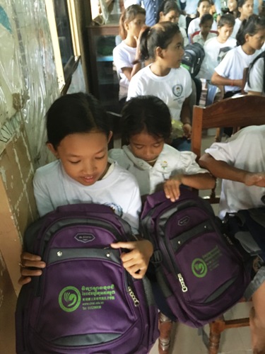 孩子们拿到孔子学院赠送的书包与文具