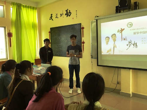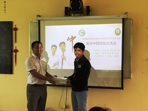 7月8日,柬埔寨王家研究院孔子学院棉芷大学中文系举行了留学中国经验交流会,由留华归国学生陈龙(CHAN CHHENG LONG)、拉威(LOVN RAVY)两名同学向棉芷大学中文系学生介绍了他们在中国留学期间的生活和学习经历。
