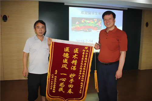 “医术精湛,一心为民”。近日,临床医学院/附属医院多科联合,成功救治一位颅脑损伤急危患者,使其转危为安。7月14日下午,患者父亲伍先生手持锦旗,来院找到正在会议室开会的张志平院长,向他表达对神经外科及全院医务人员的深深谢意。