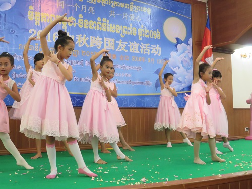 文化活动以柬埔寨的祝福舞开启,立群学校的师生为大家上演了精心准备的节目——歌曲《快乐的一天》、诗歌朗诵《水调歌头》、舞蹈《彩云追月》以及《感恩的心》手语舞。演出内容丰富精彩,在场观众既体会到中国自古以来明月寄相思的诗情画意,又欣赏到中柬文化交流碰撞出的魅力。