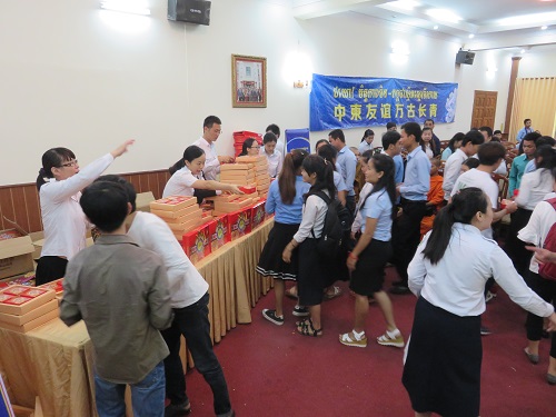 广西人民广播电台为在到场的师生赠送月饼,大家合影留念共祝中柬友谊地久天长。 (葛金良 李陆芮)