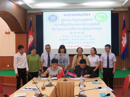 9月13日,中国广西科技大学党委副书记覃萍女士、国际合作与交流处处长邓杏华一行到访柬埔寨王家研究院孔子学院。孔子学院理事长克洛媞达院士(Academician KHLOT Thyda)、孔子学院院长谢莫尼勒阁下(H.E.CHEA Munyrith)、公派教师陈晶雯以及孔子学院志愿者教师热情接待了来宾,双方进行了友好会谈并签订教育合作与交流协议。