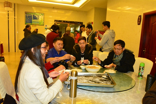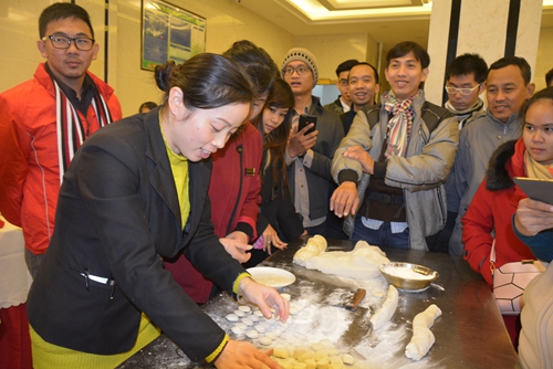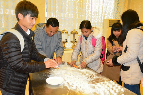 在九江学院濂溪宾馆内,体验团成员们首先学习了包饺子。和面、揉面、擀皮……在师傅的示范下,一个个精致的饺子渐渐成型。体验团成员们见状纷纷动手,亲手感受擀皮、包饺子等步骤,经过一个多小时的学习练手,战果颇丰。体验团成员、来自柬埔寨亚欧大学的唐赖兴说:“这是我第一次学习包饺子,觉得挺难的,但是过程很有趣。等我回家了,我要尝试一下包给家人吃。”