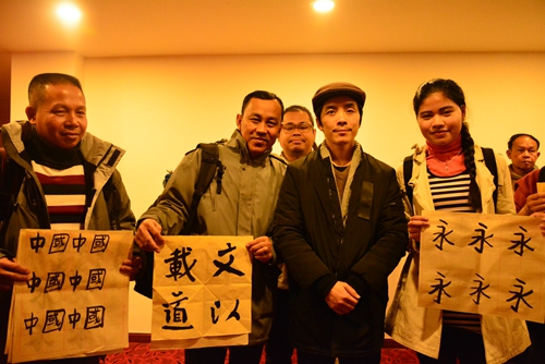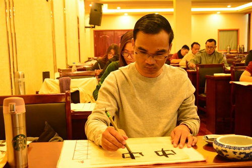 随后,来自艺术学院的王祖刚老师给大家上了一课精彩的书法课。王老师先是给大家介绍了一下中国书法的演变和发展,再示范了正确的握笔姿势之后,王老师开始教授大家学习写“永”字。通过对“永”字八法的练习,大家初步了解了书法的握笔和书写方式,并进一步学习书写“中国”、“文以载道”等汉字。来自柬埔寨暹粒省外事及投资办公室主任欧文提说:“很高兴我有学习中国书法的机会,今天学会了好几个字,从中感悟到中国传统书法文化的深厚内涵。希望以后能够学会写更多的中国汉字。”课程结束后,大家纷纷展示自己的优秀作品,和老师合影留念。