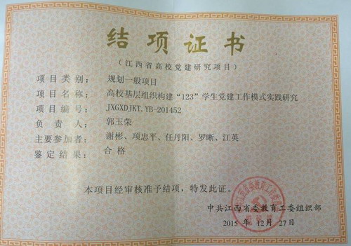 在科研与实践紧密结合的基础上,土建学院还努力将研究成果进行转化,探索学生党建工作项目化建设。2016年,在党委书记郭玉荣撰写的《高校基层党组织构建“123”学生党建工作模式实践研究》课题的基础上,总结凝练,积极参与2016年江西省高校党的基层组织建设创新成果奖的申报,并喜获二等奖,学院党建工作再结硕果。学院学生党建项目化建设首战告捷。