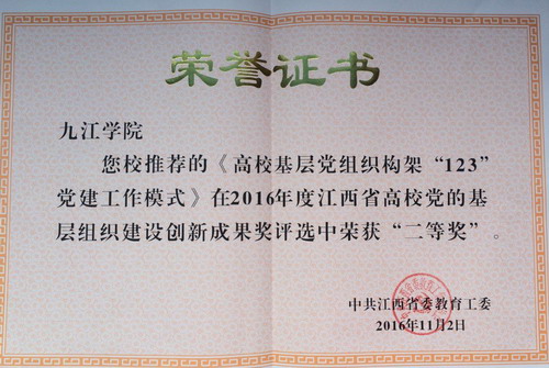 2016年11月,从江西省教育工委传来喜讯,土建学院申报的《高校基层党组织构架“123”党建工作模式》喜获“2016年江西省高校党的基层组织建设创新成果”二等奖,成为九江学院第一个也是唯一一个获此殊荣的二级学院。本次获奖,是土建学院学生党建工作成果的一次展示,一个收获,体现了土建学院多年来在学生党建工作中,狠抓思想教育,强化日常管理,规范发展程序,多措并举,勇于探索,不断创新,坚持三个结合,即“严格考察与教育培养相结合、实践探索与勇于创新相结合、项目建设与课题研究相结合”的学生党建工作思路,形成了一条具有土建学院特色的学生党建新模式。学生党建工作,土建学院“满园春色关不住,一支红杏出墙来”。