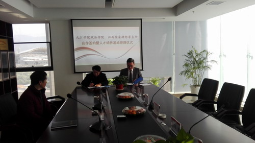 为了落实地方性卓越法律人才的培养目标,实现地方高校社会服务的功能和价值,促进和深化与律师事务所在人才培养、理论培训、实务研讨等方面的合作,3月1日上午,政法学院与江西柴桑律师事务所联合举行了合作共建签约仪式暨卓越法律人才协同培养基地揭牌仪式。政法学院詹建志院长、宛锦春副院长、曹钟安副院长,实验室主任钟文红、副主任陈昊;柴桑律师事务所主任刘晖,副主任简武、周立斌,高级合伙人田玮琅、张立陶、沈峰、潘敏等参加了仪式。