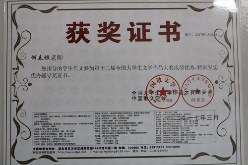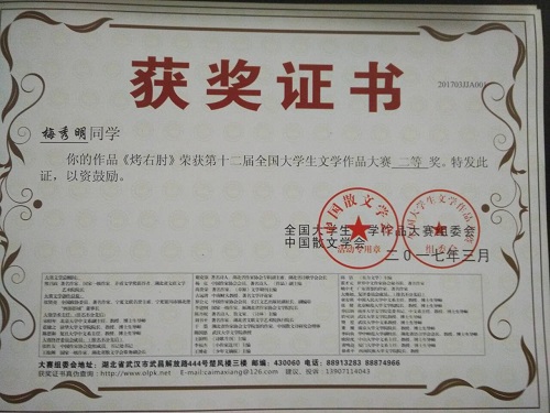 在近日举行的第十二届全国大学生文学作品大赛中,我校文传学院积极组织学生参赛,上报了21份作品,经大赛阅卷老师初评、值班评委复评、作家团终审评定,有17篇作品喜获佳绩。