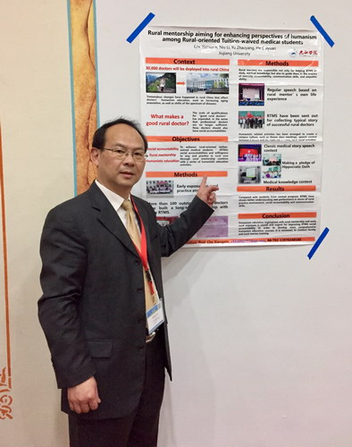 会议期间,车向新教授代表我校做了题为“Rural mentorship aiming for enhancing perspectives of humanism among Rural-oriented Tuition-waived medical students”的汇报与海报展示,并与来自突尼斯、美国、澳大利亚、牙买加、菲律宾等各国专家学者交流基础卓越医生的培养经验。牛力老师做了题为 “Joint Curriculum Development for Five-year Rural-oriented Tuition-waived Medical Students Training Program”的汇报与海报交流。