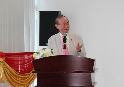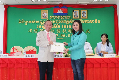 方侨生董事长(Pu Khear Se)在颁奖仪式中致辞,他指出,中国政府推行的“一带一路”政策将惠及柬埔寨的发展。纵观柬埔寨和加华银行的发展历史,加华银行离不开中文人才,中文教育对加华银行非常重要。随后,方董事长为柬埔寨孔子学院及在此任课的邢慧莹、朱云云两位老师颁发了证书和奖品,以此感谢柬埔寨孔子学院对加华银行中文教学的大力支持,并感谢两位老师的辛勤工作,他希望和柬埔寨孔子学院保持长期合作。