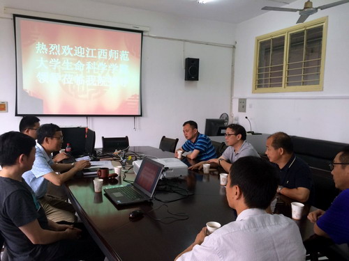 6月20日下午,江西师范大学生命科学学院党委书记胡华清和副院长邹峥嵘、谢建坤等一行5人来药学与生命科学学院开展研究生招生宣传活动,药生学院副院长鲍海鸥、团委书记徐常龙等人在心远楼413接待了胡书记一行人,大家就学生考研、专业建设等相关问题进行了交流探讨。