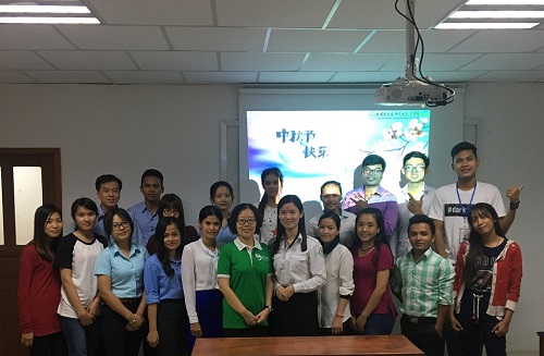 又是一年中秋时,花好月圆乐团圆。10月4日晚,柬埔寨王家研究院孔子学院亚欧大学中文系举办“花好月圆乐团圆”2017年中秋节主题文化体验活动,该活动由中秋节文化讲座、中秋月饼品尝、中秋知识竞赛和中秋诗词歌曲教学四部分组成,由亚欧大学中文系公派教师陈惠玲老师主讲。亚欧大学中文系全体教师和部分学生40余人参与。