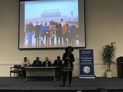 当地时间10月26日,美国萨凡纳州立大学孔子学院以“外国人讲中国故事”的方式在大学礼堂举行了一场主题为 “内视中国”的专题讨论会。孔子学院特邀今年三月赴华访问教育团的部分成员:萨凡纳州立大学副校长兼国际交流处处长伊曼纽尔(Dr. Emmanuel)、萨凡纳州立大学工程技术教育系助理教授基尚(Dr. Kisha)、萨凡纳州立大学人文艺术学院政治系教授贝赫鲁茲(Dr. Behrouz)、萨凡纳市公立中学联盟课程指导办公室主任马克·林斯基(Dr. Linsky)以及上海-美国进出口贸易有限公司顾问弗雷泽(William Frazier)作为此次讨论会的嘉宾。近百名萨凡纳州立大学在校师生前来参加了此次讨论。