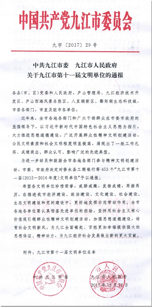 临床医学院/附属医院获评九江市文明单位荣誉称号