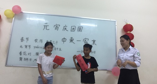 活动当晚,志愿者教师精心布置了教室,学生一进教室,浓浓的节日气息扑面而来。首先,由贾洋洋老师通过图片、PPT等形式向学生们展示并讲解了中国元宵佳节的来历和习俗。接下来是最热闹的猜灯谜活动,学生争先恐后地站到讲台上,每位学生从箱中抽取一条灯谜,大家进行了激烈的讨论,场面热闹非凡。大家都乐在其中、流连忘返。