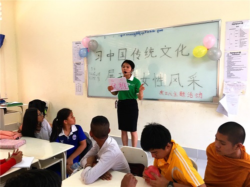 3月8日,在国际劳动妇女节来临之际,柬埔寨孔子学院暹粒吴哥高中孔子课堂举办了以“习中国传统文化,展现代女性风采”为主题的妇女节文化活动,孔子课堂50余名师生参加了此次活动。