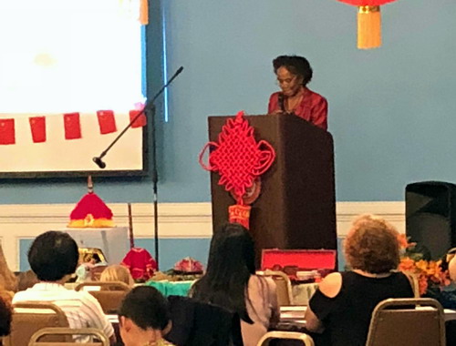 萨凡纳州立大学孔子学院外方院长佩吉·布拉德博士(Peggy Blood)用中英双语向来宾介绍孔子及其对世界文化的重要影响。