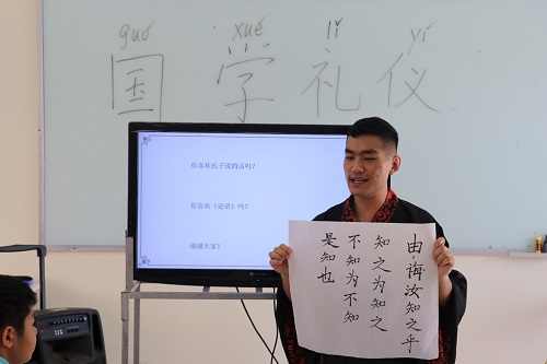 10月20日下午,暹粒吴哥高中孔子课堂为学生们准备了汉服礼仪课堂展示。王叶豪老师给学生们播放了汉服相关视频,并介绍了汉服的构成、发展历史等基本情况。随后,叶鑫老师、曾一舫老师向学生们展示汉服的基本礼仪,包括万福礼、拱手礼、士相见礼等。展示完毕后,学生们兴致勃勃地穿上汉服,亲身体验汉服礼仪,并纷纷表示这样的活动很有意思,希望以后能够再次参加。