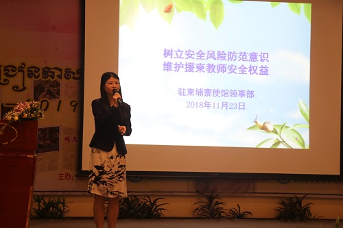 此外,本次培训还特别关注了志愿者教师们的安全。驻柬埔寨使馆领事部主任田玲女士向大家进行了安全意识培养与安全防范知识的培训;四位志愿者教师分享了自己在柬埔寨被偷盗的真实案例,给大家以警示;援柬医疗队的专家李亚楠、李嵩医生向大家介绍了在柬常见疾病预防与急救知识讲座;五位在柬优秀志愿者向大家分享了自己的工作经验、心得体会与安全防范知识,帮助新任志愿者尽快适应在柬的工作与生活。