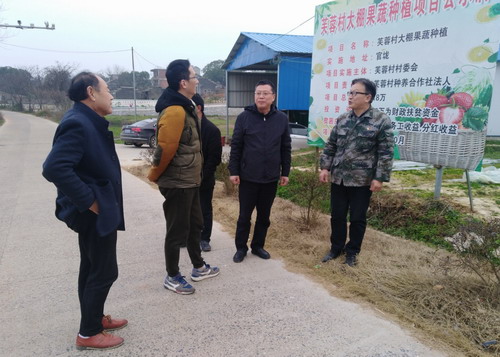 在芙蓉村第一书记李然,芙蓉村支部书记胡德森,市教育局驻村扶贫干部查览等引领下,梅龙宝一行来到芙蓉村扶梦专业种养合作社,察看合作社草莓种植和稻虾养殖情况,详细询问合作模式、种养技术和销售推广途径等。