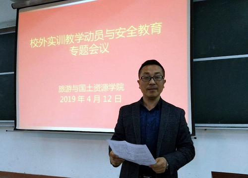 根据学校人才培养方案和本学期学院教学工作安排,旅游与国土资源学院于第八教学周将集中安排相关课程的校内外实训教学。为提高师生对校外实训重视程度及安全意识,确保校外实训教学活动圆满完成,4月12日下午,旅游与国土资源学院在竞知楼阶四召开校外实训教学动员与安全教育会。张辉副院长,实训指导老师赵军凯、冯长明、曹铭,教务科孟令凤老师及相关班级参加会议。
