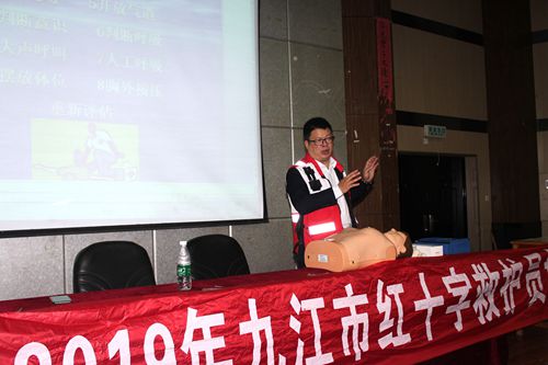 此次培训班邀请九江市红十字会杨新文老师前来授课。讲座中,杨老师采用理论讲授、操作讲解、实践操作相结合的方式,详细讲授了常见意外及突发事件的处理、 单人徒手心肺复苏操作流程、创伤救护的现场急救处理及相关的实用急救知识症与突发伤害救护等基本知识和基本救护技能,尤其在心肺复苏救护操作课上,详细讲解了心脏复苏术的重要性以及实施的主要步骤以及成人、婴幼儿等气道异物梗阻的急救方法进行了讲解和演示。心肺复苏救护操作上,学员们踊跃参加,现场模拟演示了胸外按压以及口对口人工呼吸的具体操作等急救技术,现场进行互动,通过亲自操作人体模型,进一步巩固了所学知识,掌握了现场急救的基本技能。