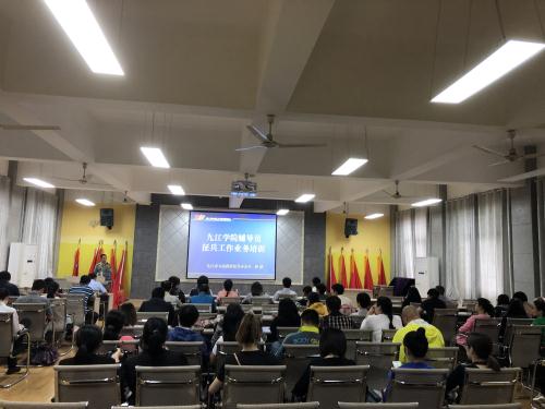 根据学校征兵工作安排,5月15日下午,学校在望庐楼101会议室举行征兵工作培训会,九江市人民政府征兵办公室、九江市军分区军动处参谋钟韬应邀担任主讲,学生处副处长郭青主持会议,各二级学院辅导员参加了培训会。