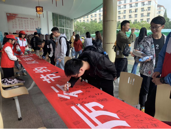 校团委、校学生会组织开展“厉行勤俭节约,反对餐饮浪费”主题宣传教育活动,开展主题微视频、平面设计作品征集,数百名青年在横幅上郑重签下名字。