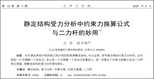 近日,我校建筑工程与规划学院土木工程专业A1713班汪珍同学在由中国力学学会、中国科学院力学研究所共同主办的北大中文核心期刊《力学与实践》上,发表了题为“静定结构受力分析中约束力换算公式与二力杆的妙用”的学术研究论文。