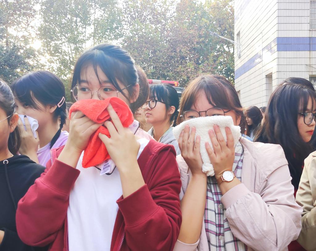 演练开始前,同学们按照要求提前准备湿毛巾,以便在演练中能够更真实地进行模拟火灾疏散的场景。保卫处副处长吴新刚对现场各部门协调完毕后,由文传学院老师何智博下达“演练开始”的命令。工作人员立即在204宿舍点燃烟雾发生器,烟雾开始扩散,“被困同学”在窗前呼救,路过同学发现火情,并发现同学“被困宿舍中”。她一边大喊“宿舍着火啦!”一边拨打火警电话119,她准确向火警接线员报告了着火地点、火势大小、被困人员情况等信息。