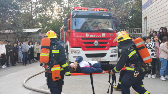 紧接着,消防车辆到达火灾现场,消防队员、老师与学生干部组织同学们有序疏散,他们利用预先准备好的湿毛巾捂住口鼻,低姿弯腰从着火楼栋有序撤离到安全地带。同时,消防队员则利用9米拉梯在2楼起火房间救援“被困同学”,使用求生气垫将该同学营救至安全地带。待命在室外一楼地面佩戴空气呼吸器的两名消防战士将伤员担架抬至安全地点。