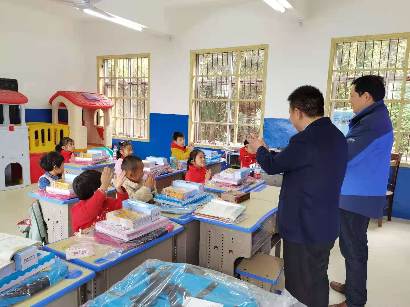 校工会为同学们一一发放了爱心书包,在发放爱心书包的同时,还询问了同学们的学习及生活情况,并嘱咐同学们要好好学习,天天向上。