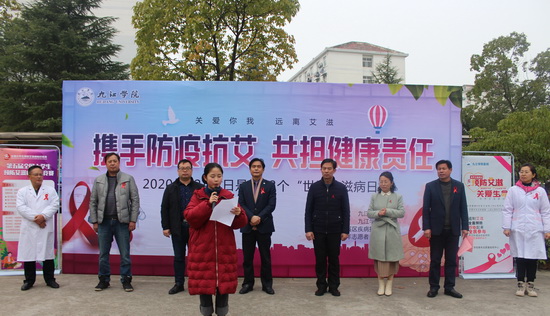 12月1日是第33个“世界艾滋病日”,由校医院、校团委联合濂溪区疾控制中心、学生唯医服务队在学校三食堂前的广场举行“世界艾滋病日”宣传教育系列活动。副校长杨耀防,九江市疾控中心党委书记唐亚平、副主任熊飞宇,濂溪区疾控中心主任邵卫兵、九江学院校团委、校医院负责人以及濂溪区疾控中心、校医院相关人员、学生唯医服务队等共计400余人参加了此次活动。